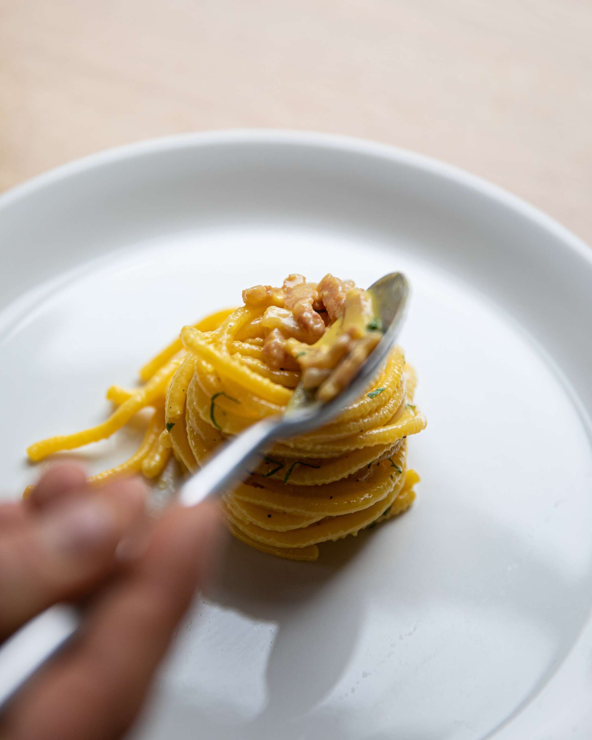 Place a heavy pot on the stove and turn your heat on maximum.When the pot is Feel up a pot with water and bring it to boil, then add rock salt. Start to cut your guanciale or pancetta, first of all clean the cured cut from the skin and the layer of pepper, then slice the meat around 1cm thick and then cut it in chunks (around 2cm). Place the Guanciale in a cold pan, without any oil and turn the heat on minimum. In this way you will melt completely the fat in your meat. It will take around 10 minutes, until the Guanciale it will be crunchy and with a nice caramelization. In a metal bowl (big enough to hold the cooked pasta) add your Egg-yolk, parmesan and pepper. Mix everything with a whisk or a fork until you will reach a thick mixture. Place your pasta in the boiling water and cook it until “al dente”. In the mean time you cook the pasta you can add to the eggs the fat that been released from the pork and mix everything together, keep the meat on a side, we want to keep the Guanciale crunchy. Place your bowl on the pasta water ( bain-marie ) and let the eggs mixture reach the temperature 30-40 Celsius, keep mixing the eggs during this process. Ad this point you can your pasta straight to the metal mixing bowl tighter with your eggs and give them a proper mix until smooth and creamy, add your guanciale and serve straight away. Carbonara is a game of temperature, the pasta dish have to be creamy and the eggs don’t have to be coagulate, when the pasta and eggs are together the temperature have to be below 60-65 Celcius. This recipe is a good tricks for beginners because you don’t add the eggs straight to the pan, sometimes even if you don’t realize the pan is still hot and this gonna let you coagulate the eggs.