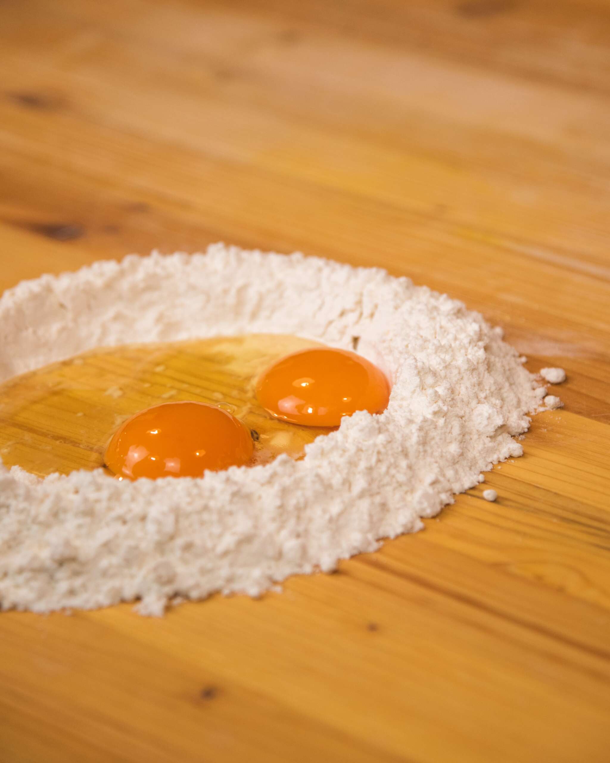 Start by place your flour on a working table (wood itโs the best surface but you can you any surface you have in your kitchen). Make the classic โfontataโ and then add the eggs in to the flour.